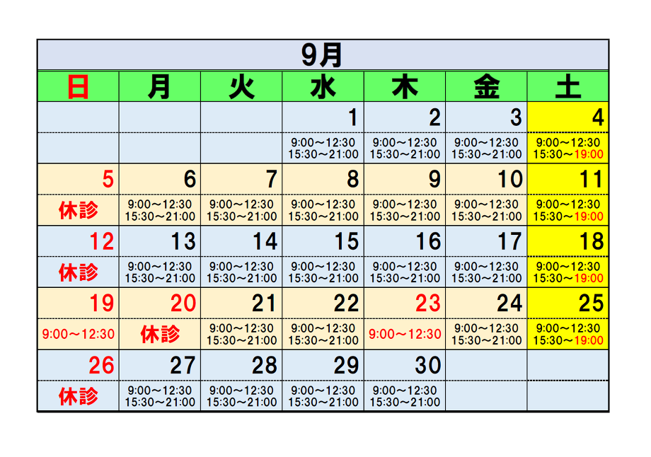 令和3年9月の診療予定