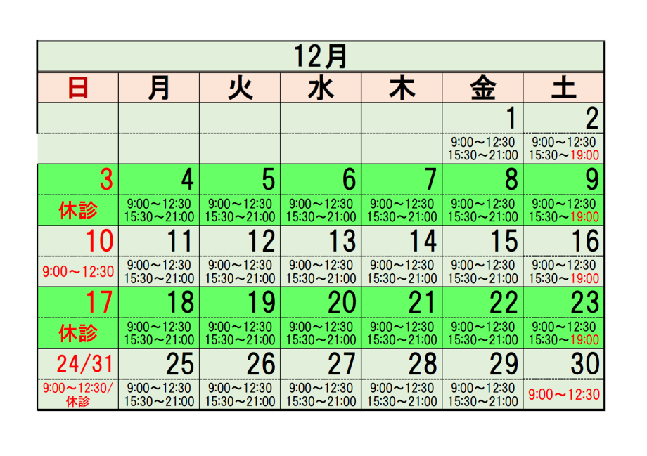 令和5年12月の診療予定