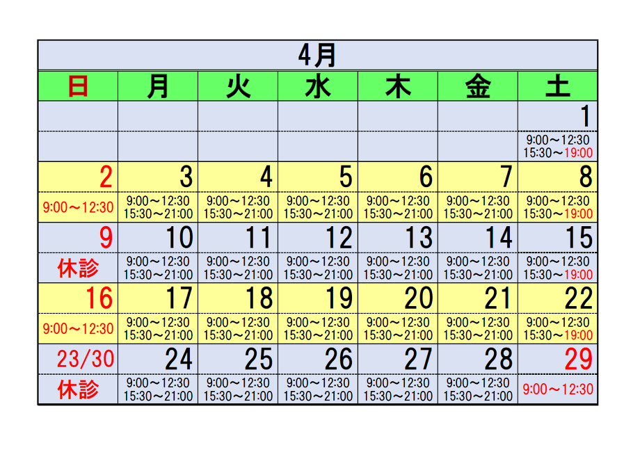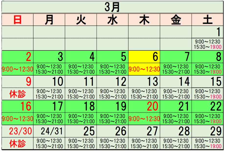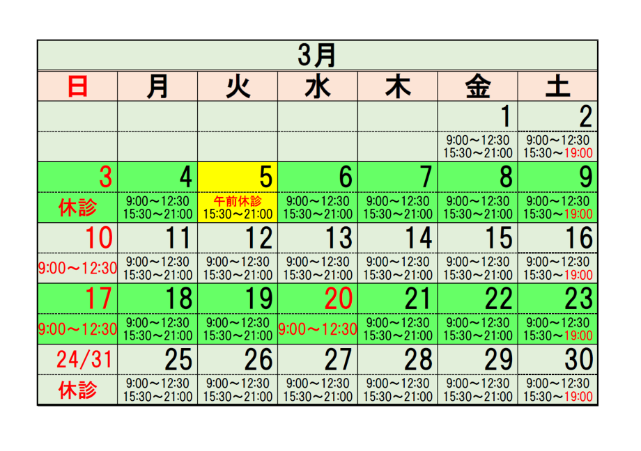 3月の診療予定を掲載いたします